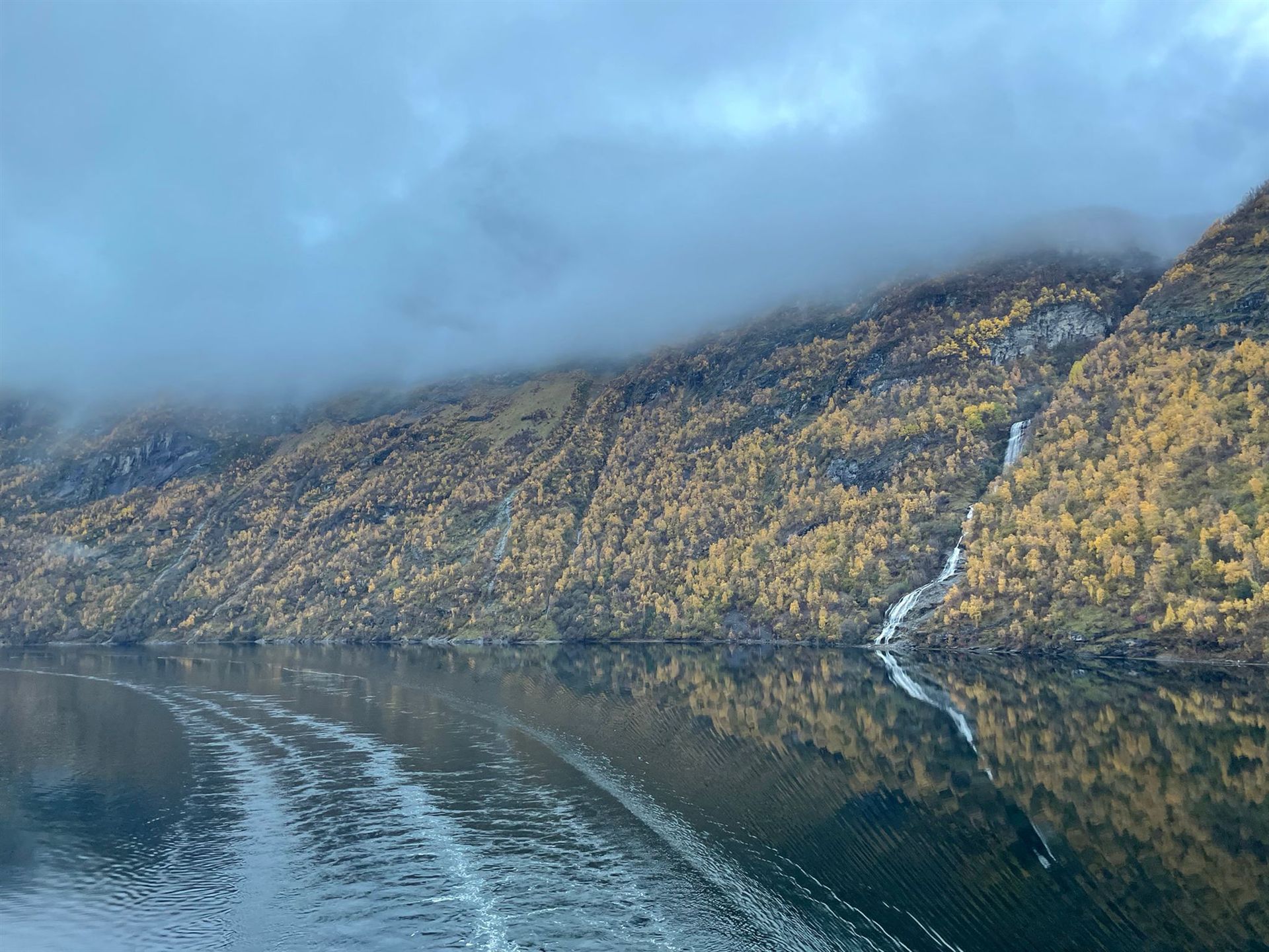 Am frühen Morgen fuhr das Schiff durch den legendären Geirangerfjord – eines der spektakulärsten Naturwunder Europas. Wasserfälle stürzten in die Tiefe, Nebel hing über den Bergen, und immer wieder glitzerten kleine Bauernhöfe an den steilen Hängen.
