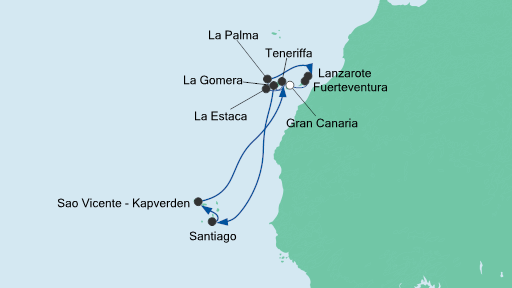 Reiseroute: ab Las Palmas (Gran Canaria) - San Sebastian de La Gomera (La Gomera) - 2 Seetage - Praia (Santiago) - Mindelo (Sao Vincente) - 2 Seetage - Santa Cruz de Tenerife (Teneriffa) - Puerte de La Estaca (El Hierro) - Santa Cruz de La Palma (La Palma) - Arrecife (Lanzarote) mit Liegezeit über Nacht - Puerto del Rosario (Fuerteventura) - Las Palmas (Gran Canaria)