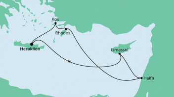 Reiseroute: ab Heraklion (Kreta / Griechische Inseln) - Erholung auf See - Limassol (Zypern) - Haifa (Israel) - Erholung auf See - Rhodos-Stadt (Rhodos / Griechische Inseln) - Kos-Stadt (Kos / Griechische Inseln) - Heraklion