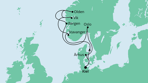 Reiseroute: ab Kiel (Deutschland) - Seetag, Stavanger (Norwegen) - Vik (Norwegen) - Olden (Norwegen) - Bergen (Norwegen) - Oslo (Norwegen) mit Liegezeit über Nacht - Århus (Norwegen) - Kiel